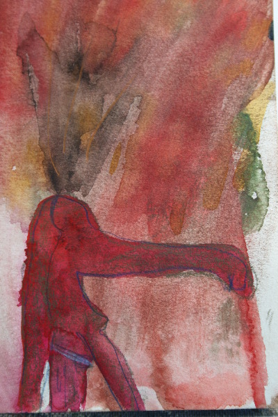 Raphael Walzer Tusche/Ölkreide/Papier 60 x 50 cm 2016 Links oben einen Dämon der die Butzenscheiben einschlägt. Es handelt sich um ein Zitat aus Grünewalds Versuchung des Hl. Antonius, Hinweis auf den nationalsoz. Widersacher, der in Walzers Leben einbricht.